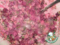 Отваренную предварительно свеклу нарезать не мелкими кубиками. |