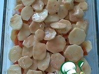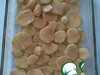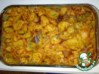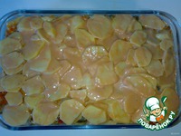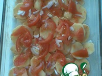 Картофель режем кружочками, смешиваем с майонезом, кетчупом (картошка получается красивого цвета и со вкусной корочкой), по вкусу добавляем специи. И выкладываем первый слой. |