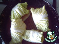 Начиняем овощами пекинскую капусту и делаем рулетики. Отправляем их на сковородку, добавляем стакан воды с 1 ст. ложкой томатного соуса и тушим 5-10 мин. |
