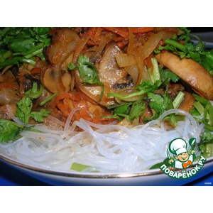 Выкладываем овощно-грибную смесь на фунчозу. |