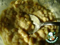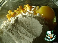С кукурузы сливаем воду, добавляем яйцо и муку |