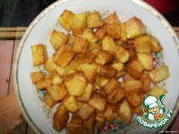 Картофель почистить, нарезать кубиками немного крупнее, чем на "Оливье" и обжарить до золотистой корочки. Лучше во фритюре, но можно и на сковородке. |