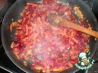 Натереть отваренную свеклу, добавить к остальным овощам, обжарить все овощи отправить в кастрюльку к капусте |