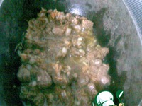 Когда мясо готово, нарезаем мелко 1 луковицу, натираем на мелкой теркe 1 морковку, обжариваем в чугунке, затем добавляем туда мясо. |