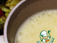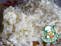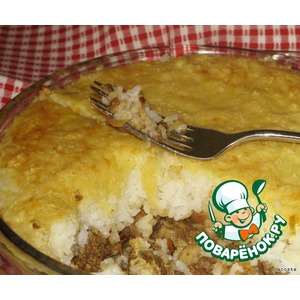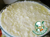 Соединить рис с белками и аккуратно перемешать. Огнеупорную форму смазать сливочным маслом, выложить 1/2 часть рисовой массы. |