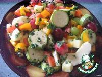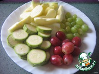 Кабачок режем кружочками. Яблоко очистить от кожуры, удалить сердцевину, нарезать ломтиками. Ягодки винограда оборвать с гроздьев, промыть. |