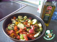 Выложить всю нашу красоту в огнеупорную форму, полить оливковым маслом и добавить полстакана воды. |