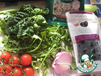 На блюдо выложить руколлу, нарезанный шпинат, томаты, лук (тонкими кольцами), сыр (кубиками), оливки, заправить оливковым маслом, уксусом бальзамическим, лимонным соком, соевым соусом, посыпать сухариками и зеленью. Bon Appetit!!!