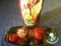 Пассерованые овощи соединяют с рисом и майонезом . Начиняют помидоры фаршем и укладывают на сковороду и запекают в духовом шкафу |