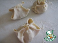 Делают колбаску из теста, делят на кусочки и раскатывают так, чтоб тесто в середине было потолще, а по краям тоненькое. Чтоб при готовкe тесто снизу не порвалось. |