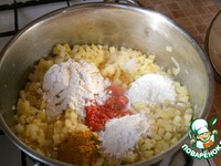 Добавить к ним томатную пасту,муку,щепотку сахара,1 чайную ложку карри,соль и 0,5 л воды.Перемешать. |