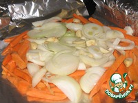 На фольгу выложить морковь, лук и чеснок (крупно порезанные) |