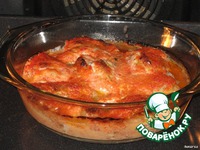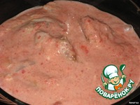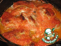 курицу переложить в форму для запекания. В помидорно-чесночную смесь добавить майонез и залить этой смесью курицу. |