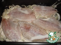 На лук выкладываем любое рыбное филе (у меня тилапия), посолить, поперчить и залить сливками. |