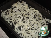 На смазанный подсолнечным маслом противень выкладываем лук, нарезанный полукольцами. |