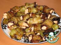Берем "язычек" баклажана, на край кладем начинку и сворачиваем рулетиком. Все готово! Приятного аппетита!!! |
