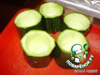 Кабачок или цуккини разрезать на несколько частей, примерно 5-6 сантиметров. Аккуратно чайной ложкой извлечь мякоть, но оставляя дно чаше. |