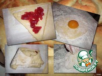 На каждый треугольник выложить по ложке варенья. Поскольку у меня варенье закончилось раньше, чем тесто, на часть треугольников я положила по половинке консервированного абрикоса. |