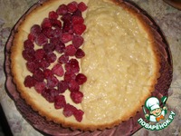 Далее на остывший корж выкладываем фрукты - у меня половина семьи любит сладкое, а половина нет, и мы решили разделить пирожок по-братски, Нам с дочей малинка, а сынуле с папой банановое пюре. |