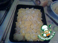 Наливаем на противень масло. Пропущенный через чеснокодавку чеснок выкладываем на дно. Затем режем на комбайне "МУЛИНЕКС" картофель, кружочками. Выкладываем на противень. Солим по вкусу. |