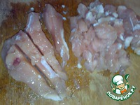 Ставим духовку на 180 градусов. Режем грудинку сначала на полоски,потом на мелкие кубики.Солим,перчим |