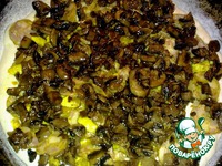 В смазанную маслом и присыпанную мукой форму выкладываем 2/3 теста. Сверху мясную начинку и грибы |