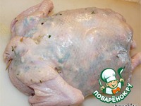 Описание: Весь секрет этой курочки под кожей. Курица фаршируеться копченной грудинкой (или сырокопченым беконом), зеленью, чесноком. Обязательно наличие кинзы!!! Кинза в сочетании с копченостью и чесноком придаeт новый, необычный вкус обычной курочке. Источник рецепта "Едим дома" с Ю. Высоцкой.