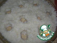 Рис отварить почти до готовности, в подсоленной воде. Воду слить, рис промыть. Выложить его первым слоем в форму. Утрамбовать. |