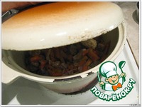 Добавить бульон, чтоб покрылся весь плов, накрыть и тушить на медленном огне 15 минут |