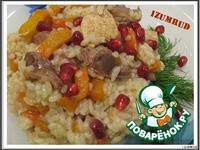 Рис помыть, половину выложить в казан и разровнять, посыпать солью и гранатом и ещё раз повторить: рис, соль, гранат |