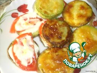 Раскладываем на тарелке: кабачок, смазываем майонезом+чеснок, затем помидор - и так чередовать в зависимости от желаемой высоты блюда |