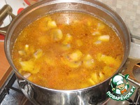 Когда грибы сварятся (минут 15 их проварить), добавить картофель, нарезанный кубиками. |