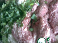 Добавить мясной фарш (у меня остатки субстанции под названием куриный фарш). Добавить специи и зелень. |