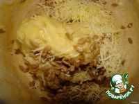 Тесто. Воду с сливочным маслом и солью доведем до кипения Всыпаем муку и быстро замешиваем тесто. Дайте тесту немного остыть добавляем яйца. Хорошенько перемешиваем. Добавляем тертый сыр и семечки |