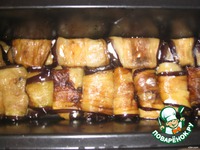 В остывшие баклажаны мы заворачиваем небольшие кусочки сыра фетаки. Складываем их в жаропрoчную посуду. |