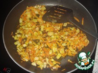 Морковь натереть на тёрке, лук нарезать кубиками и обжарить всё на подсолнечном масле до золотистого цвета. |