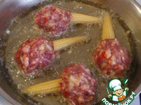 Каждую порцию мясного фарша налепить на основание кукурузного початка в виде шарика(так,чтобы получилась фигурка, напоминающая круглый леденец на палочке). |