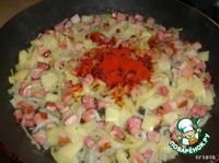 Добавляем красный сладкий перец и муку, хорошенько перемешиваем. |