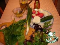 Часть лука порезать мелко, а вторую часть крупно. Шпинат резать не очень мелко, остальную зелень порезать как обычно. Все смешать и заправить оливковым маслом с уксусом. |
