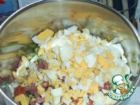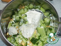 Добавляем сметану, все овощи и колбасу перемешиваем и солим, добавляем очень холодную воду. |