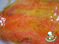 В смеси из горчицы, масла оливкового, соли, перца и кленового сиропа замаринуем форель. |