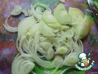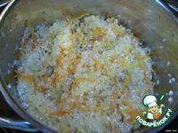 режу лук полукольцами. Наливаю в толстодонную кастрюлю растительное масло и обжариваю лук на среднем огне до средне-золотистого цвета. |