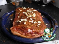 Посолить , поперчить, посыпать специями, сделать надрезы - повтыкать чеснок и сверху посыпать порезанным чесноком |