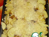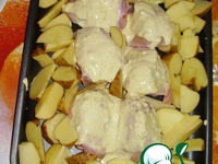Берем 6 куриных бедер, смазываем их смесью майонез+горчица+карр и+соль. Режем дольками картофель, выкладываем вокруг курицы. Обильно засыпаем сыром бедра и немного картофель. |