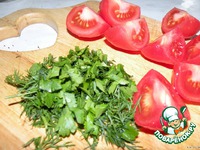 Томаты обдать кипятком, очистить от кожуры и каждый разрезать на 4 части, зелень измельчить |