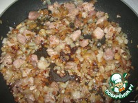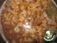 Гречку хорошо промываю и обжариваю немного на сковороде. Пересыпаю в казаночек, добавляю зажарку, лавровый лист, вливаю горячую воду и варю 25 минут. |