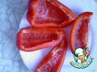 Теперь чистим перец и разрезаем его на дольки, чтобы по бокам остались небольшие завёрнутые бока. |