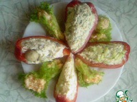 Приблизительно одну десертную ложку с горкой смешиваем с нарезанным меленькими полосочками огурцoм. Такую же порцию смеси смешиваем с нарезанными грибочками. |