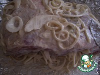 Потом 3 ст. л. майонеза и лук, который вы сняли с мяса, перемешать, очень хорошо этой кашицей обмазать мясо, замотать в ту же фольгу, положить на форму, запекать при 200*С 2 часа.