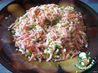 Яйца и ветчину трем на терке, лук мелко режем. Все перемешиваем и солим по вкусу. |